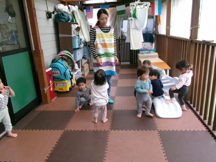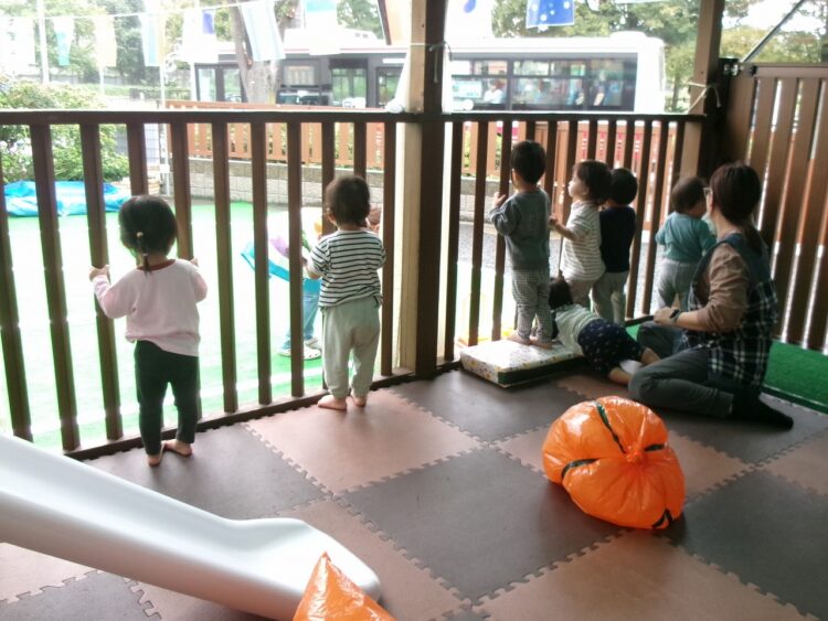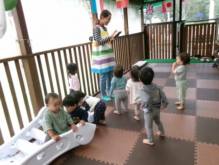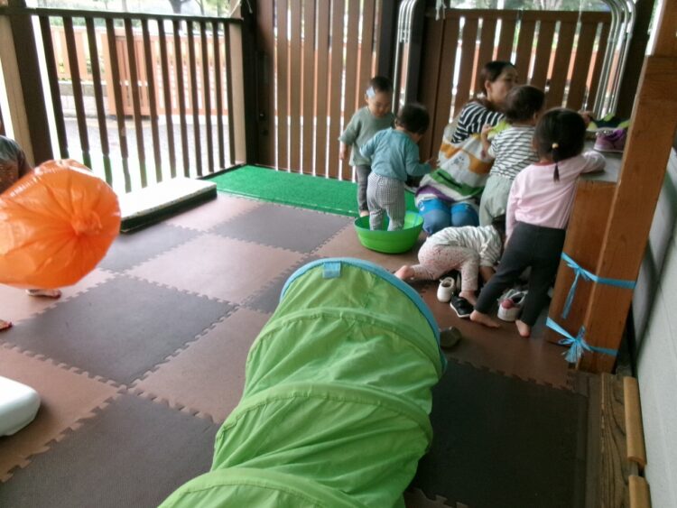パンダさんの芸術保育の間、テラスで遊んで待っていてくれたウサギさんとコアラさん。