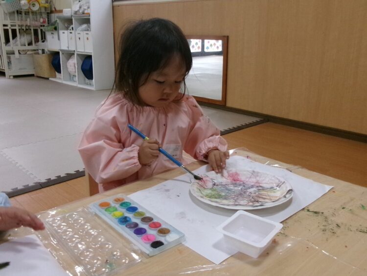 最後に、紙皿の淵にも紅葉のように色付けします。