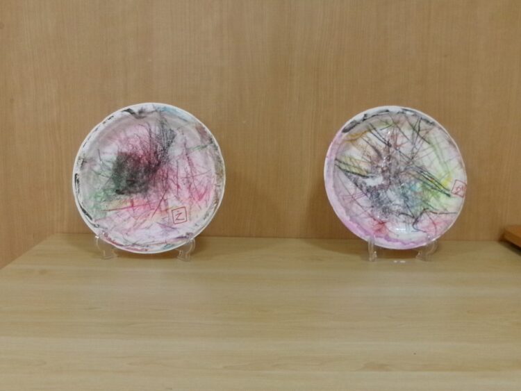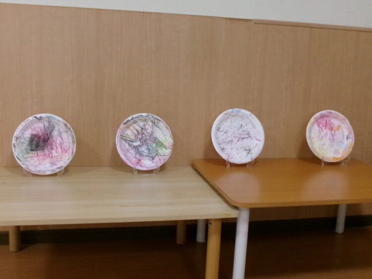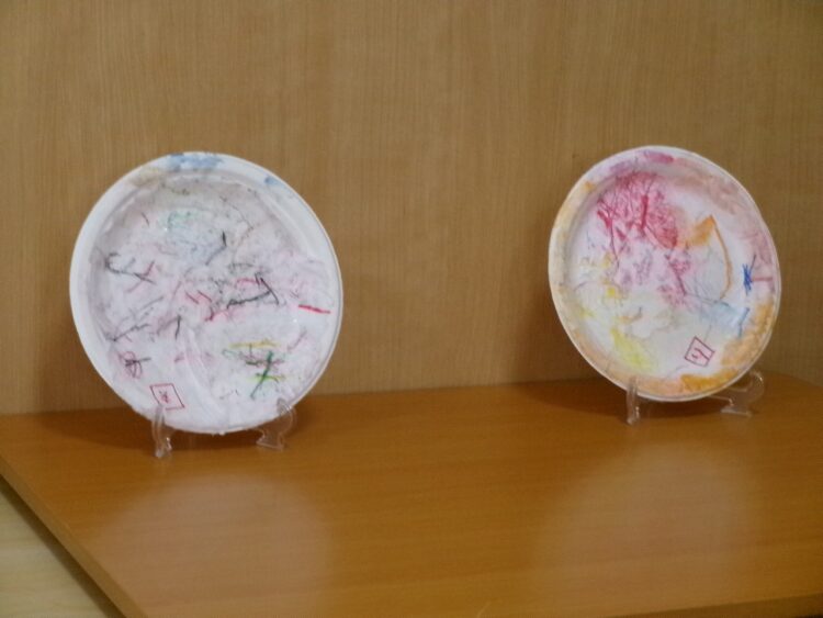 次のに水で溶かしたボンドを紙皿にたっぷりと塗って、こすり出した紙を貼り付けていきます。