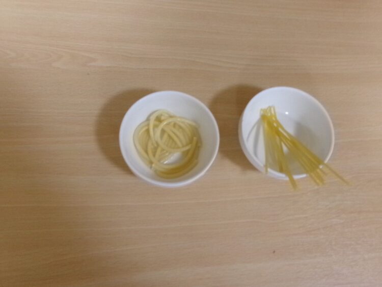 茹でる前のパスタと茹でたパスタ…。見た目は同じかな?