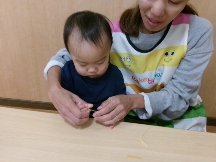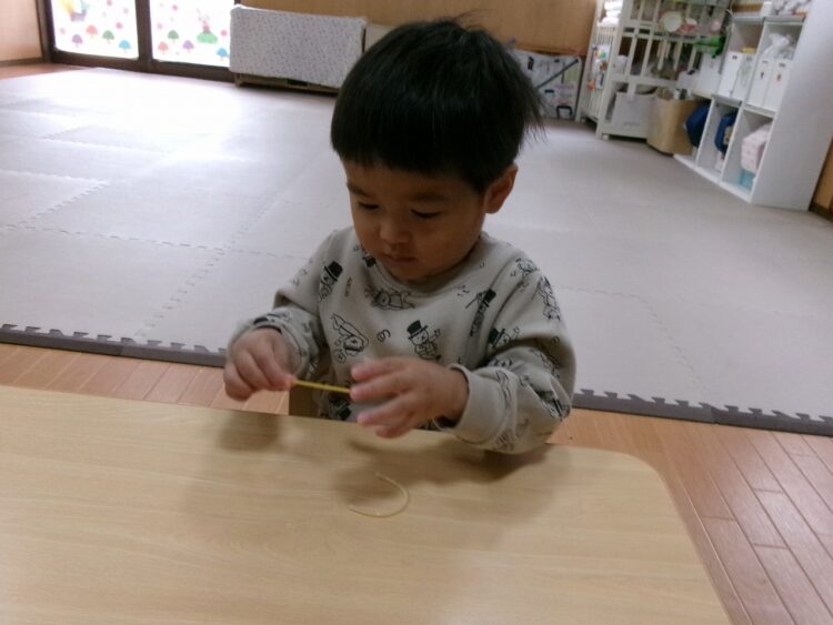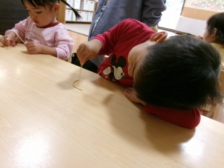 パスタを折ってみたり、味見をしてみたり…