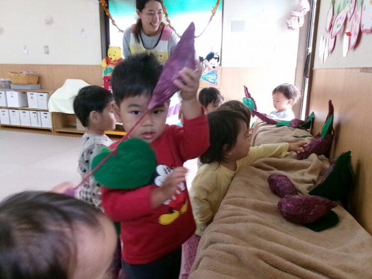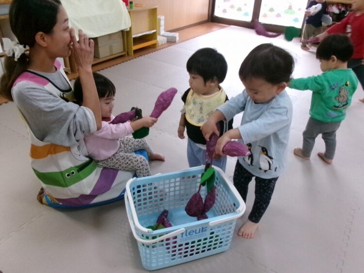 今年は残念ながら本物のお芋掘りには行けないため、調理さんが手作りしてくれた本物のようなサツマイモを使って、スイートポテト作りに使うお芋を掘ってみることになりました(≧▽≦)