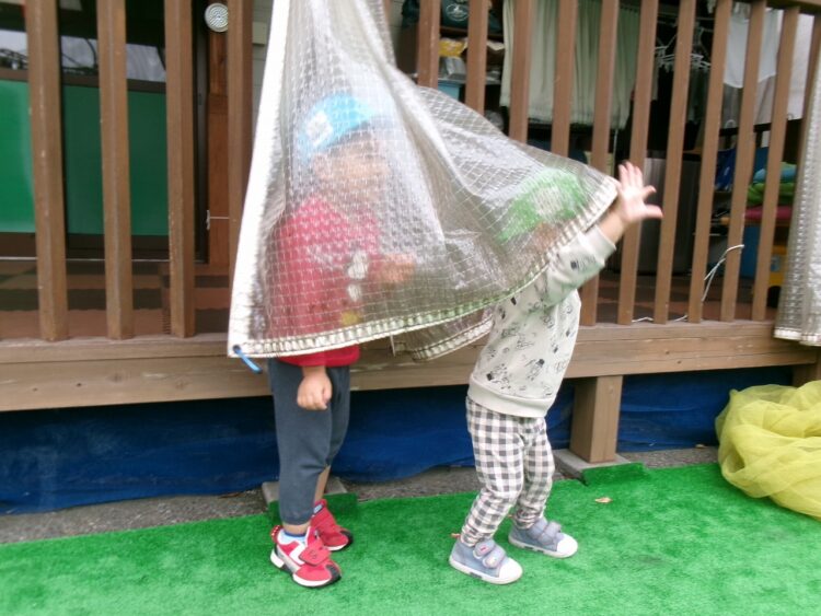 かくれんぼをして遊び、園庭にはにぎやかな笑い声が響いていました!!