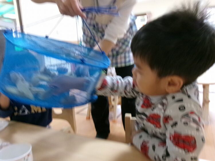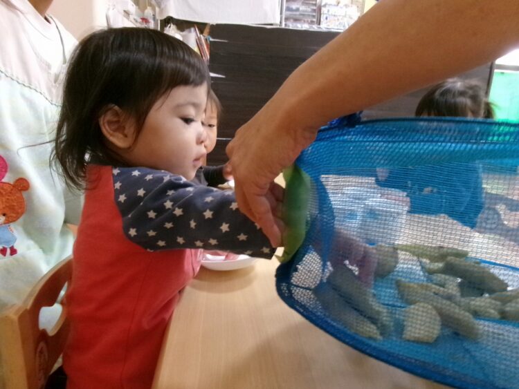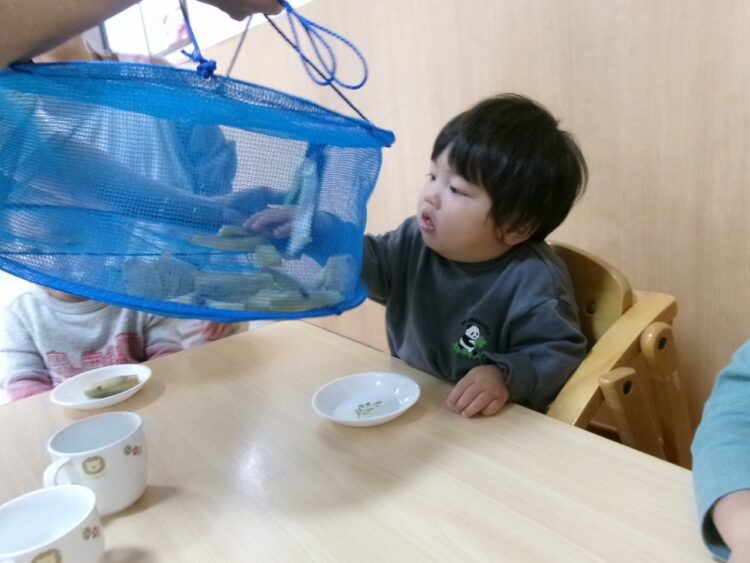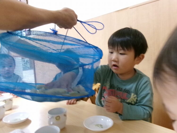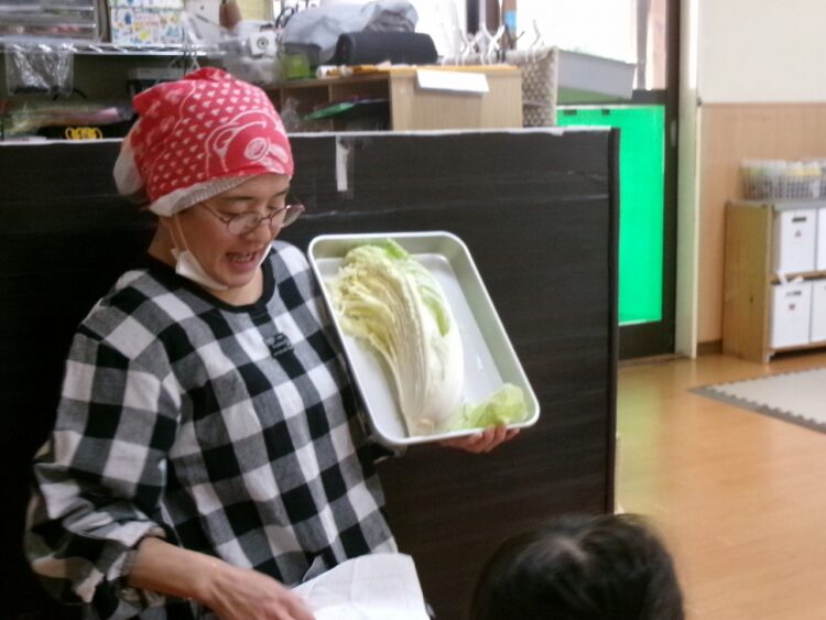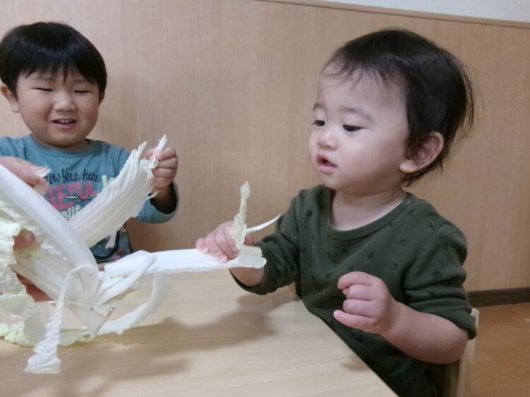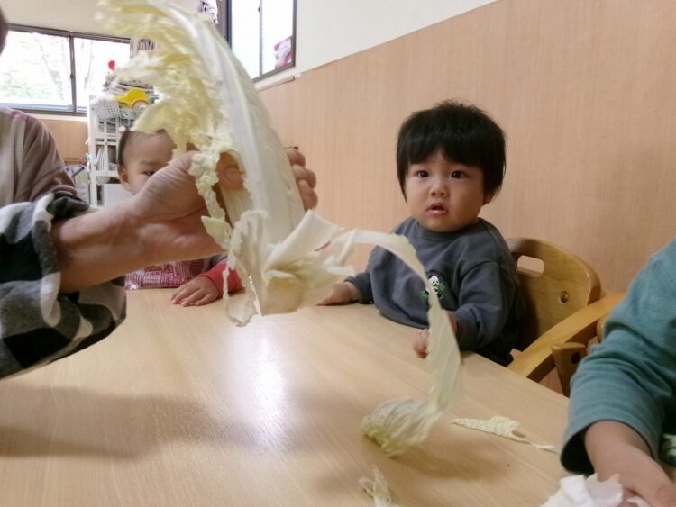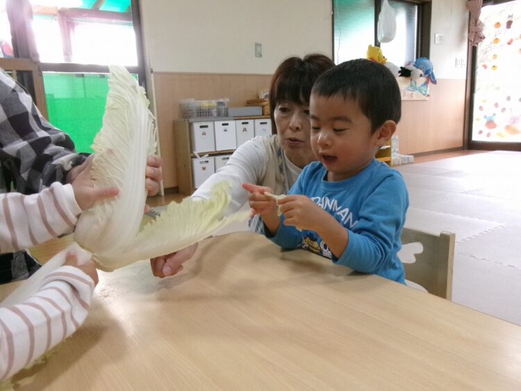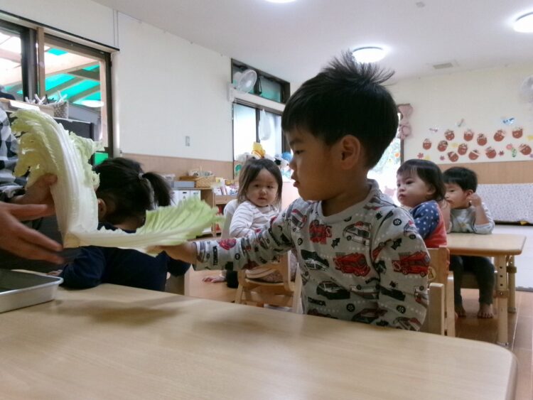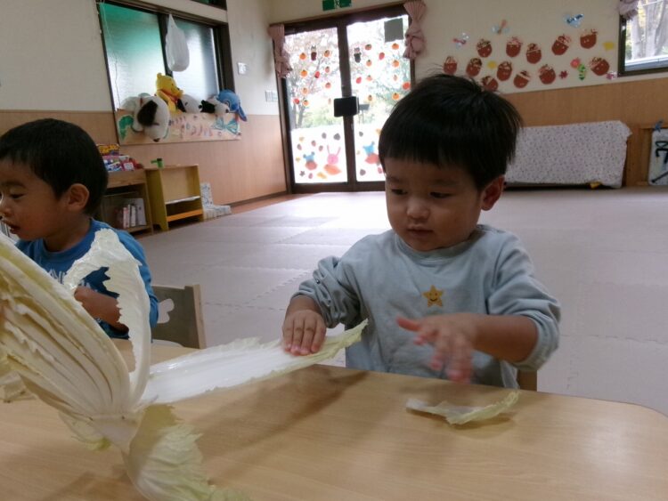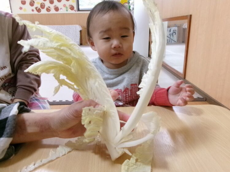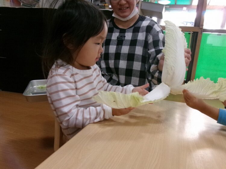 白菜の葉っぱは、「白い色の所と、緑(黄緑、黄色)の二つ(二色)あるんだよ」と教えてくれた〇〇ちゃん。