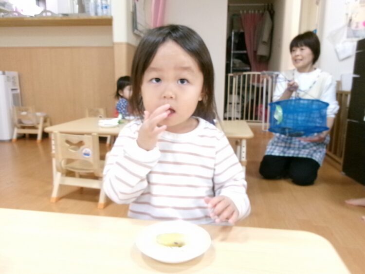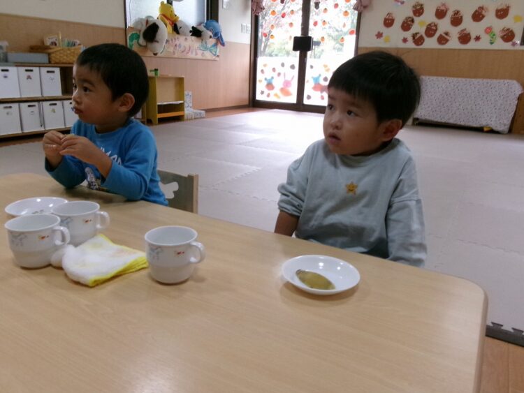 朝のオヤツには、調理さんが手作りしてくれた「干し芋」です。