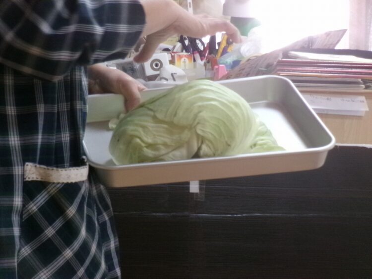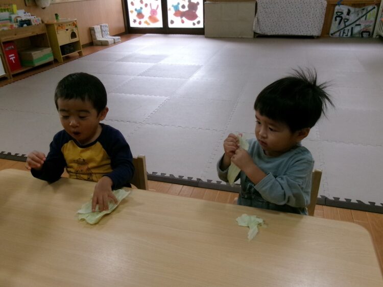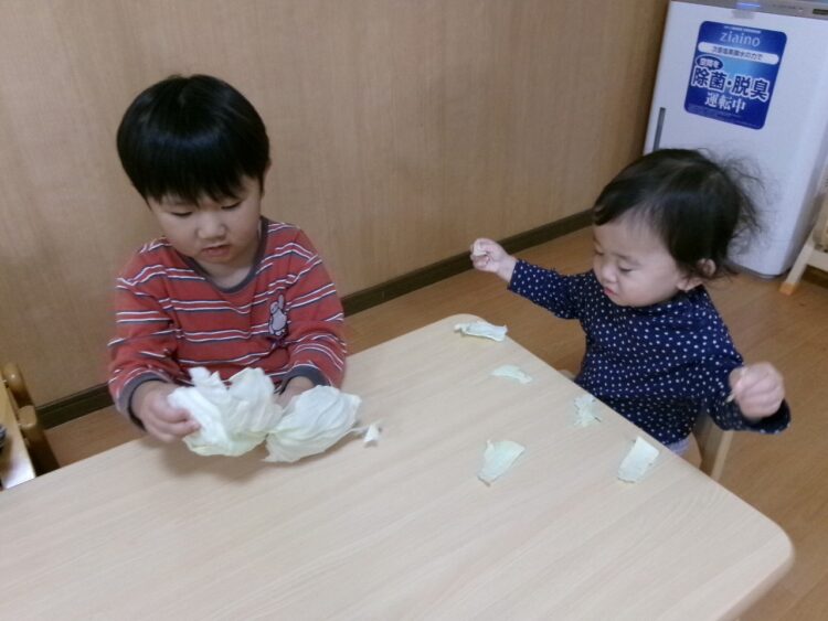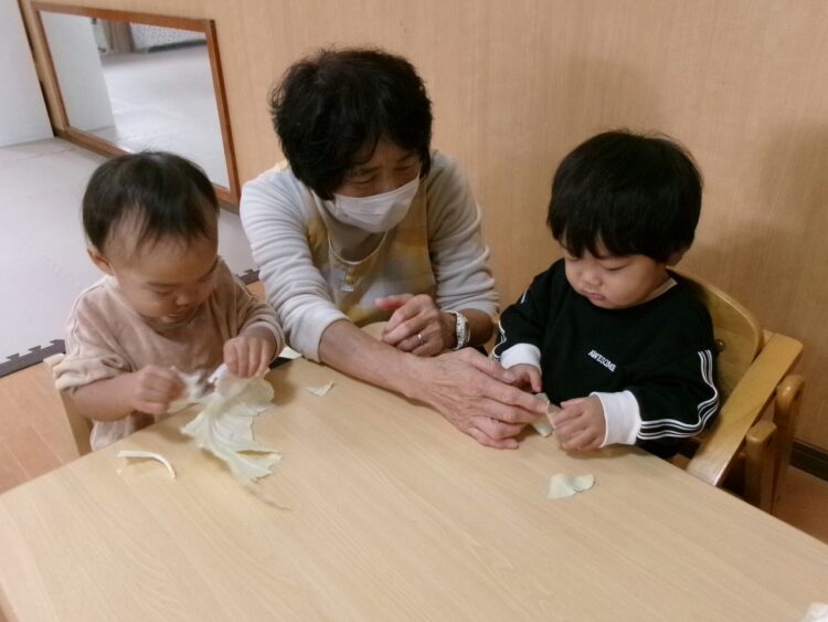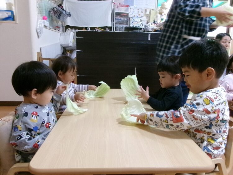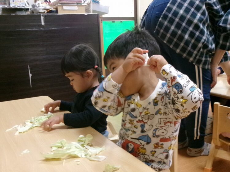 キャベツの葉っぱを食べやすい大きさにちぎるお手伝いです。