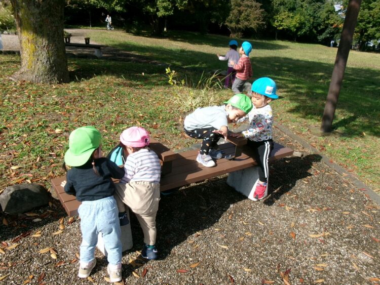 「ベンチの電車だよ~♬ ガタン、ゴトンッ🚃」