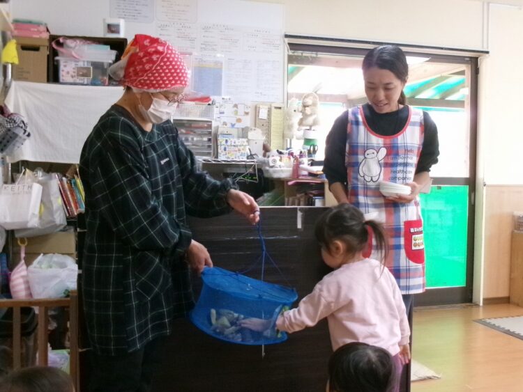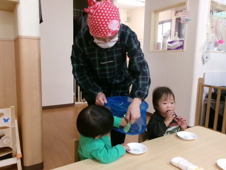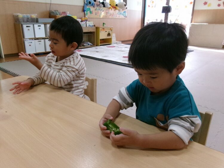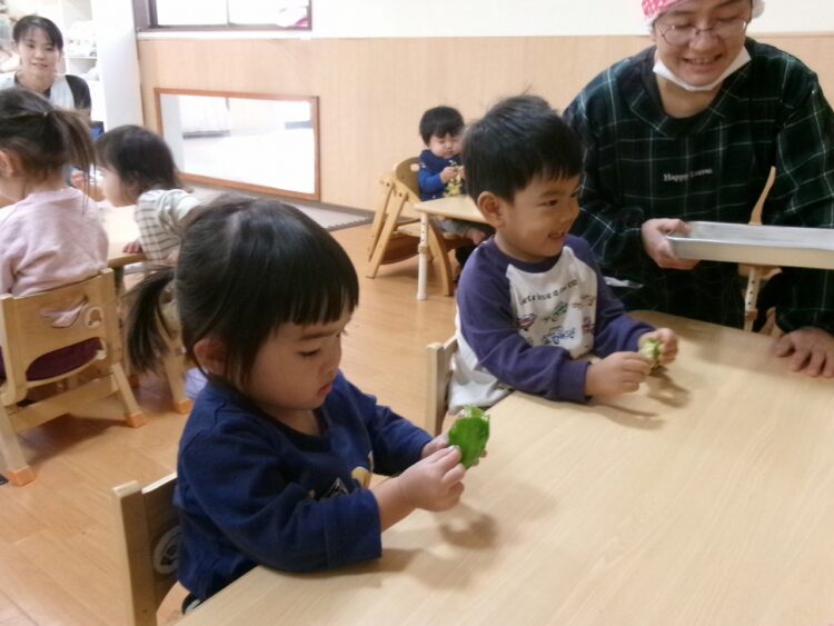 実はこのサツマイモ、卒園児さんが幼稚園でお芋ほりをしてきたおすそ分けと、保護者の方から頂いたさつま芋を使って、調理さんが干し芋を作ってくれたんです(≧▽≦)