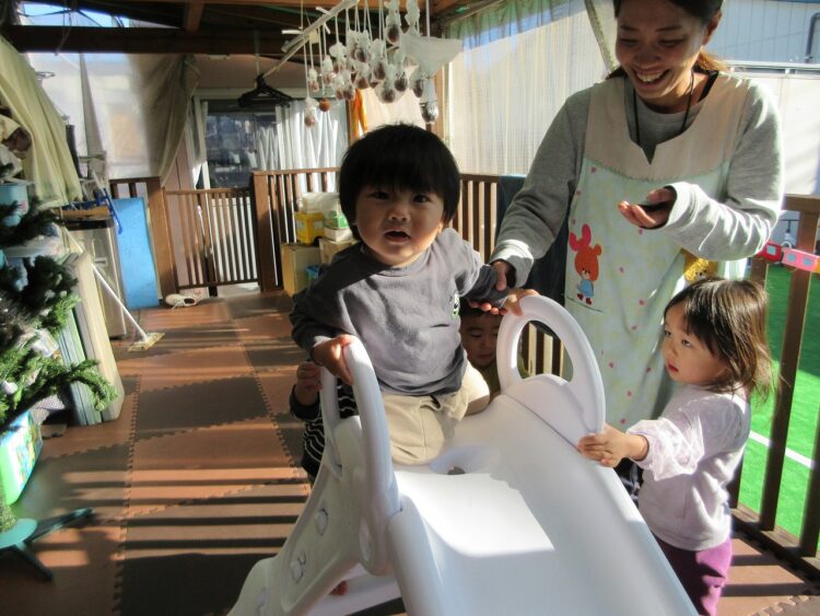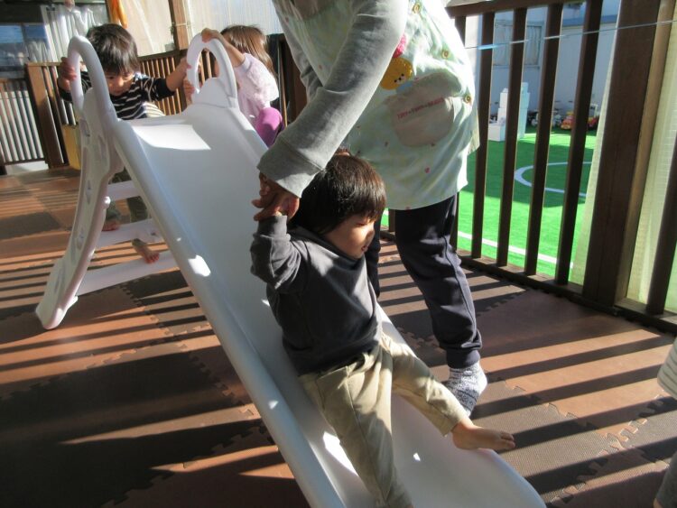 テラスもぽかぽかであたたかいので、滑り台遊びです(*^_^*)