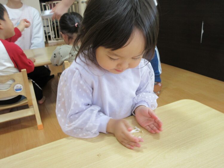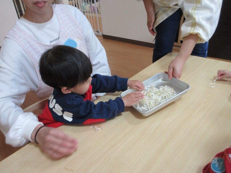 「もやしはね~、こうやってちぎるのよ♬」〇〇ちゃんが教えてくれました♡