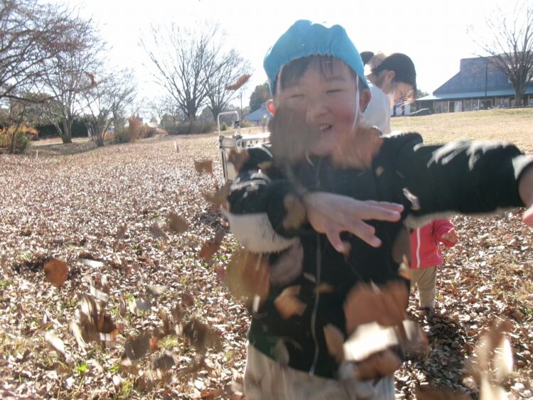 バサーッ! カメラ(保育士)も落ち葉のシャワーを浴びました(笑)