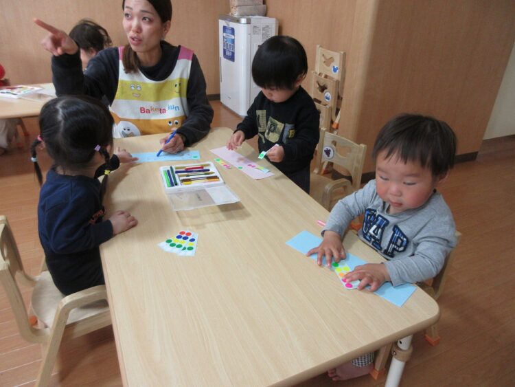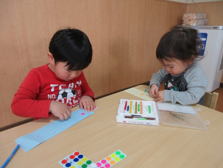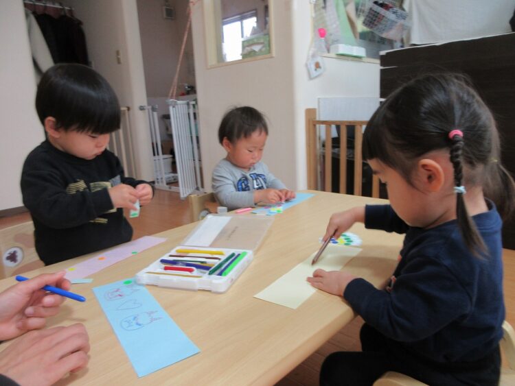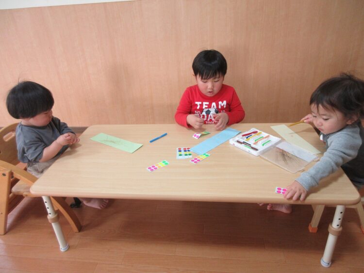 お絵描きが好きな子、シール貼りが好きな子と様々…。