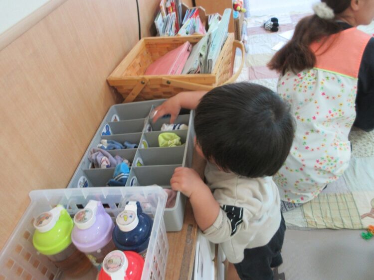 お友だちのマークと顔も少しずつ覚えてきて、お散歩前にはお友だちに靴下を渡してくれることもあります!