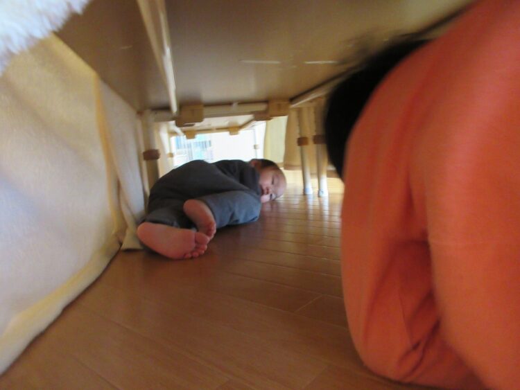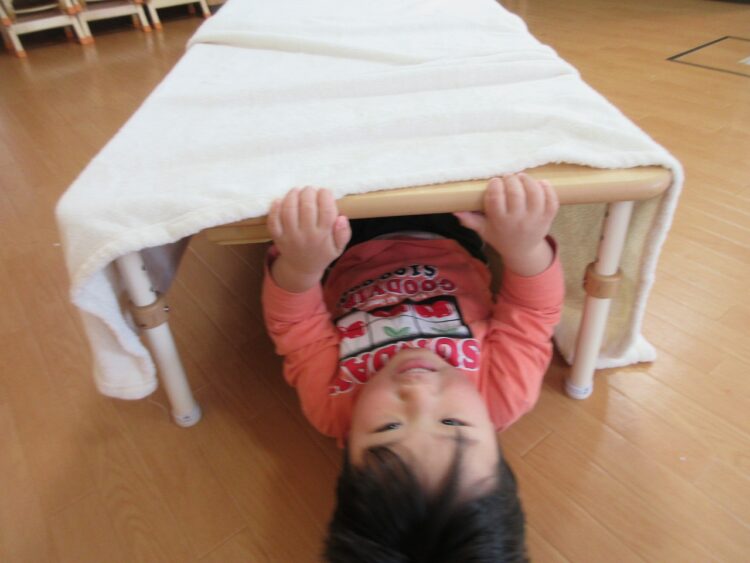 低いテーブルの下を、ワニさん歩き(ほふく前進)をして全身運動♬