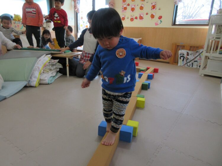 コルクブロックの平均台を渡り…