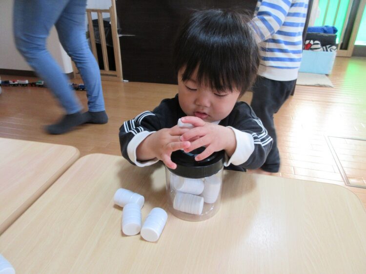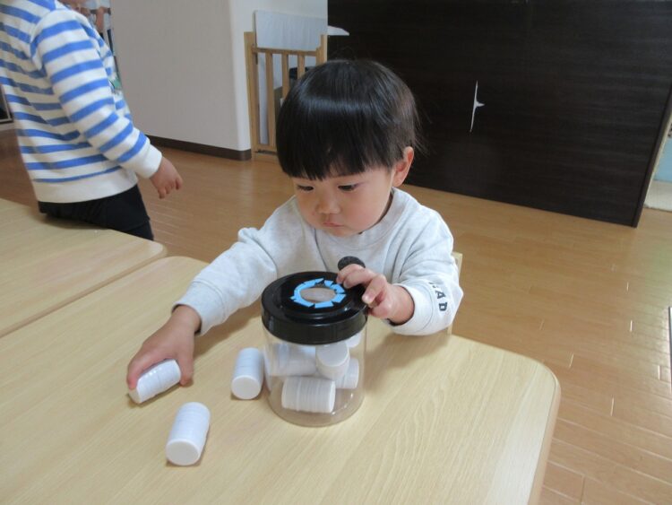 保育士さんが手作りしてくれた「穴落とし」のおもちゃ。