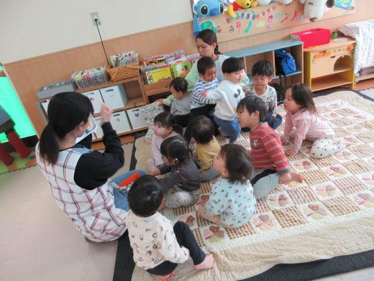 絵本を見て、今日も穏やかに保育がスタートです(´ω`*)