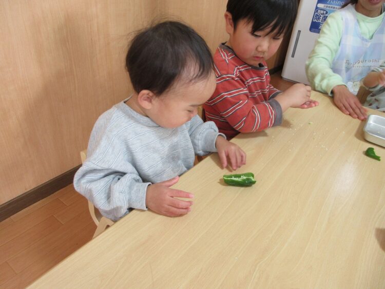 「あれ?? ピーマンの中に何かある!!」