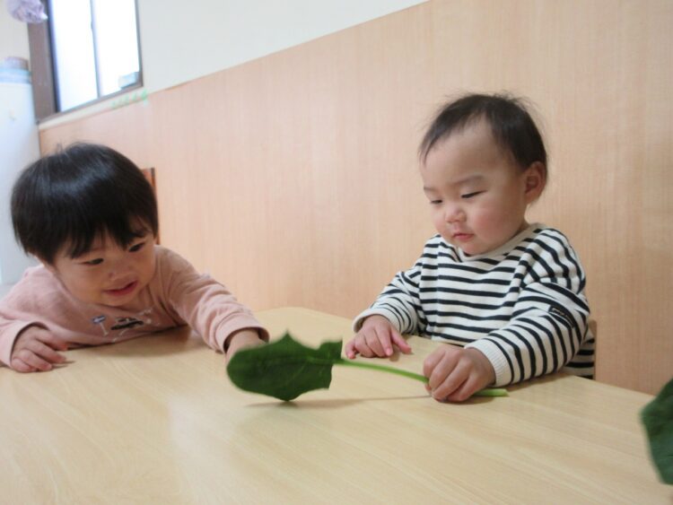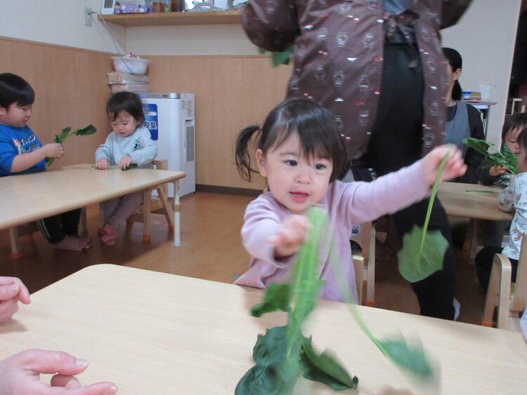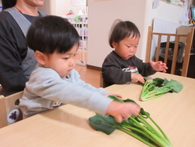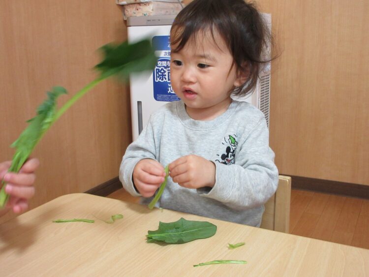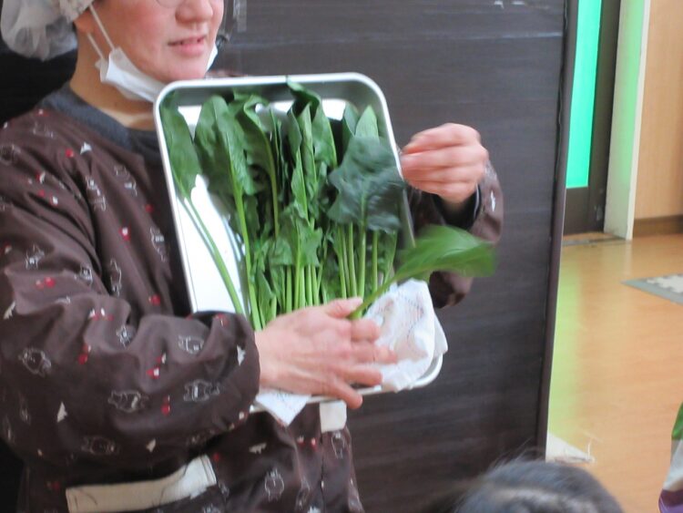 食育に登場したのは、お尻の赤い「ホーレン草」