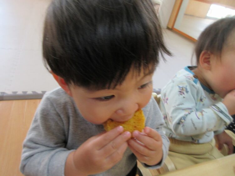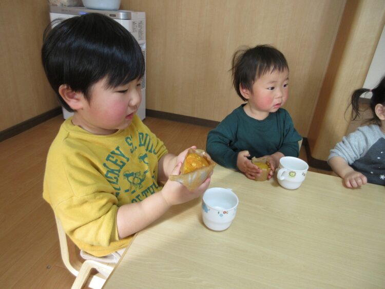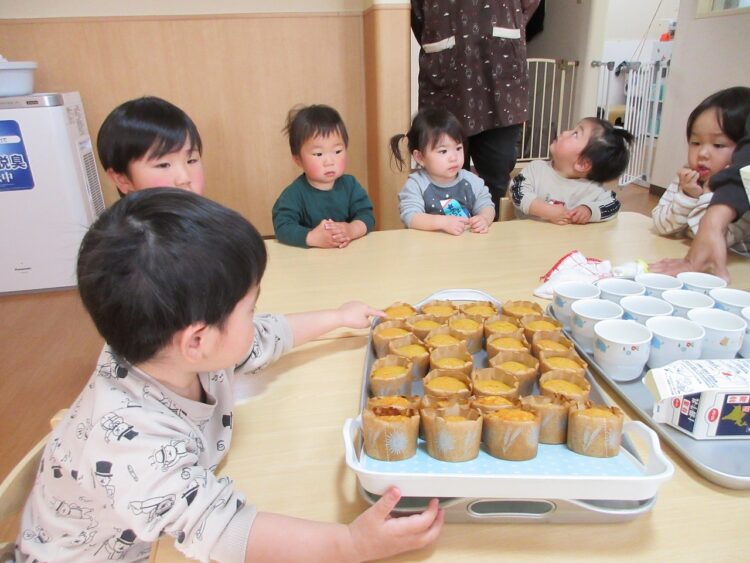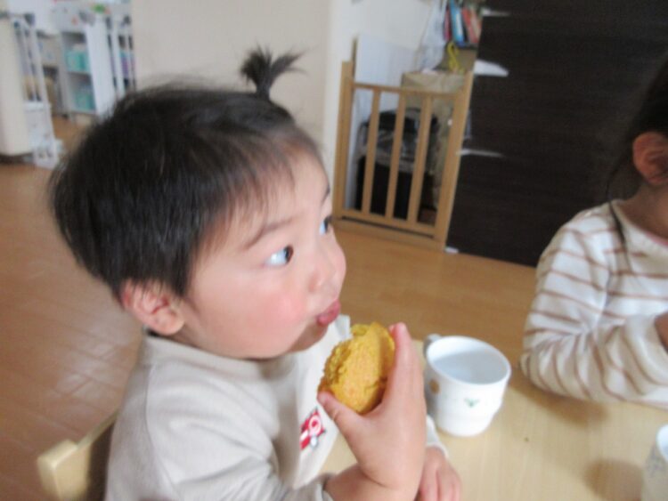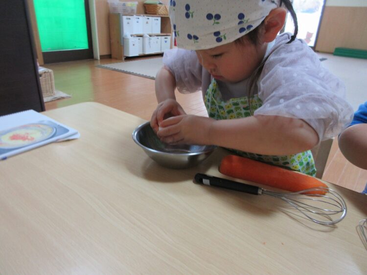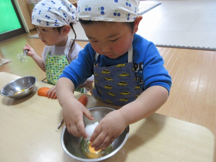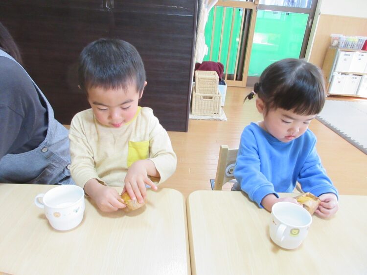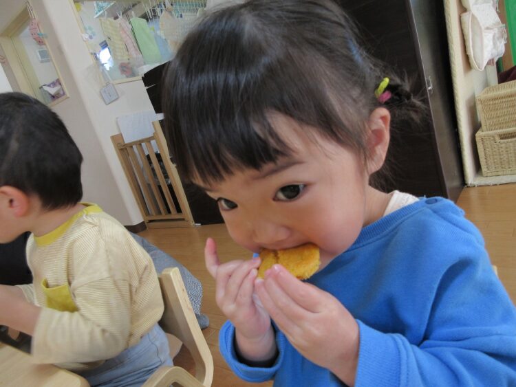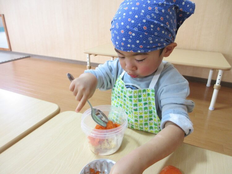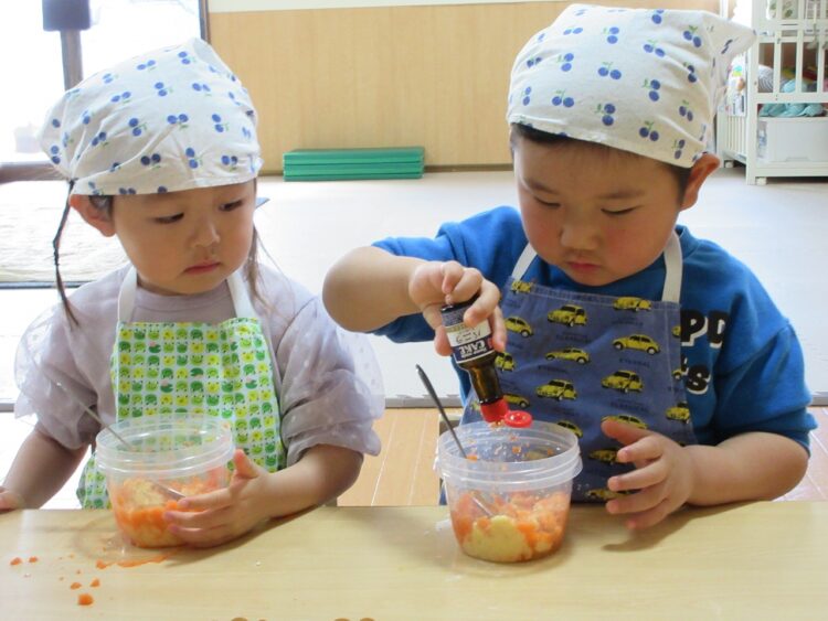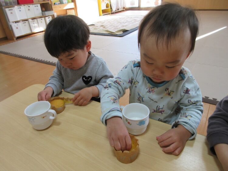 2歳児ぱんだグループさんの「クッキング保育」がありました。