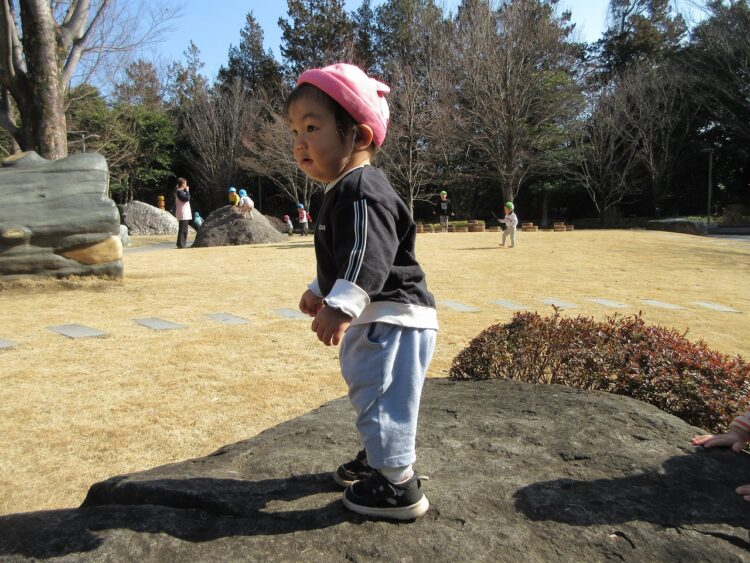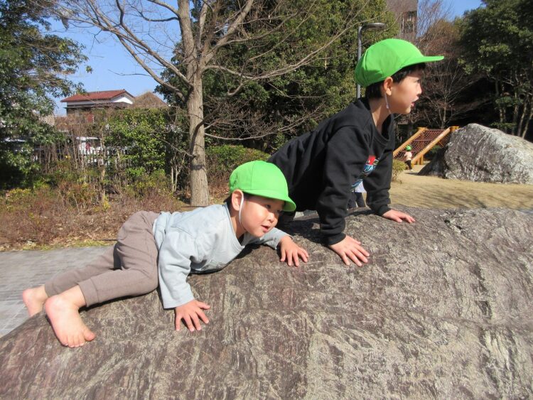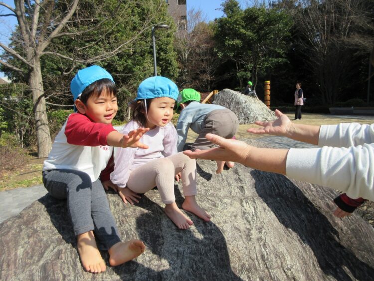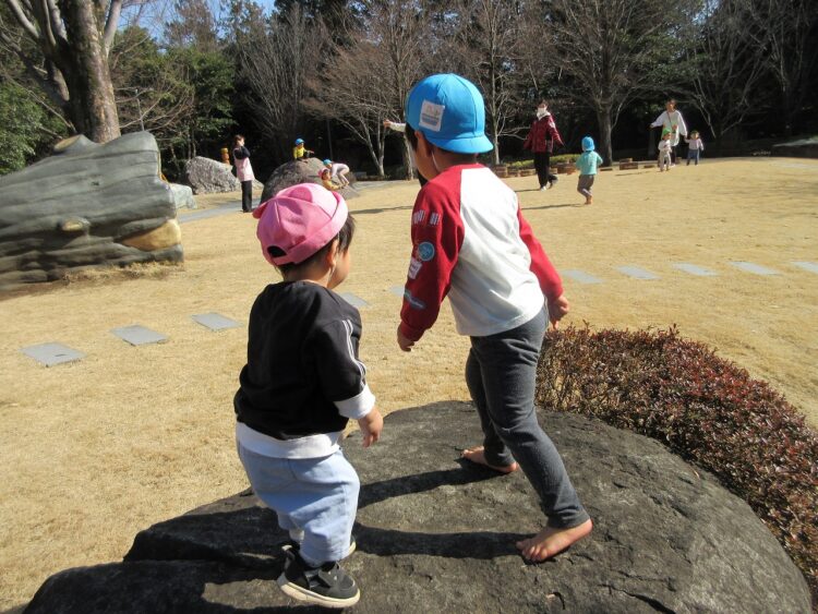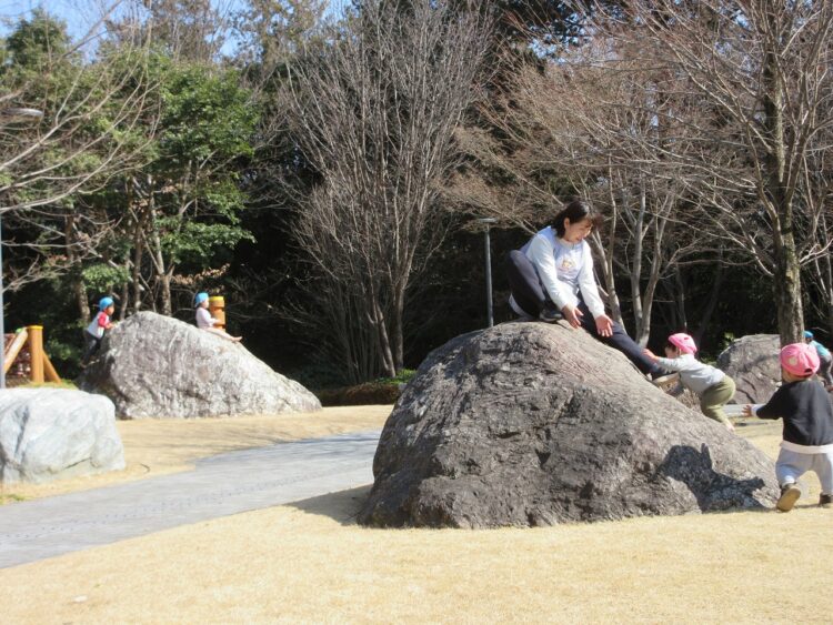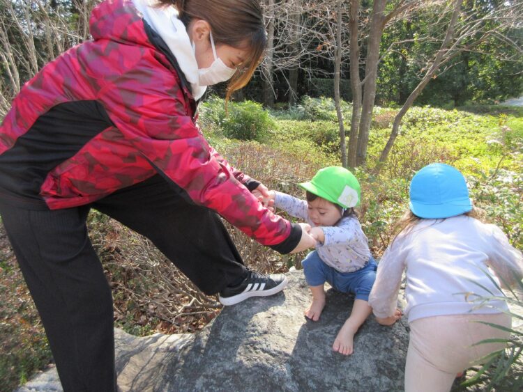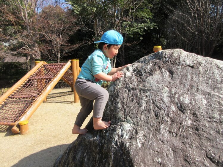 ふれあいの森公園で遊ぶ時、岩登りなどはすべらないように素足になっています。