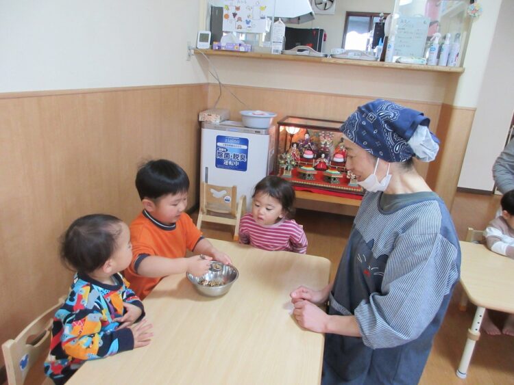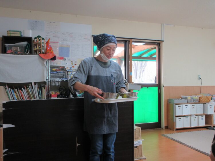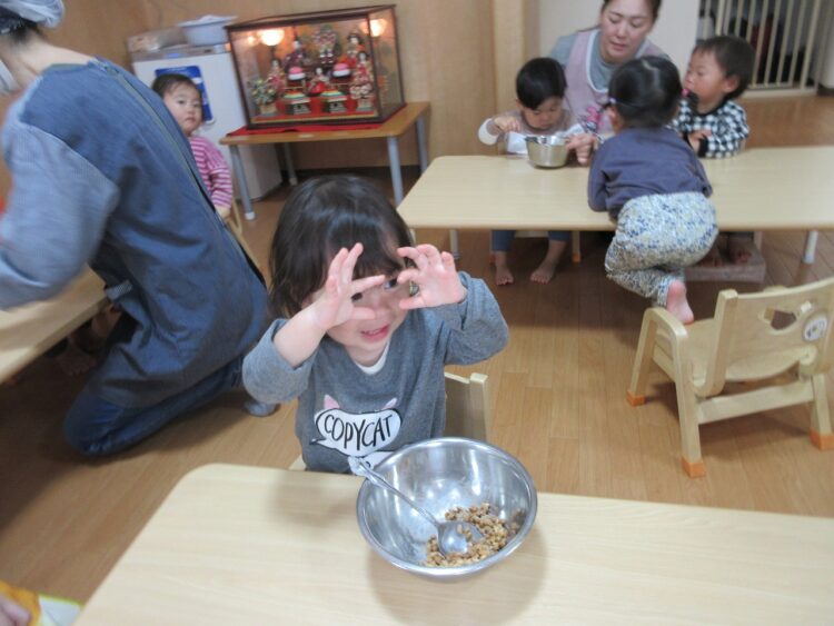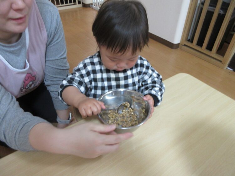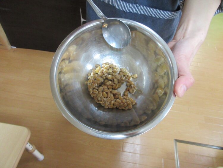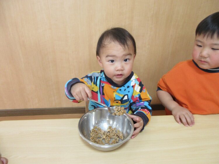食育に登場したのは、さくらんぼさんの大好きな「納豆」