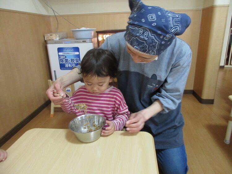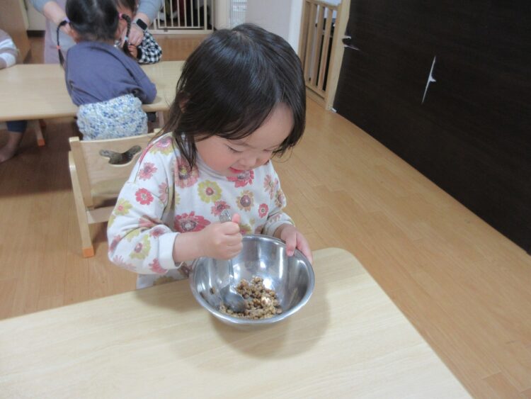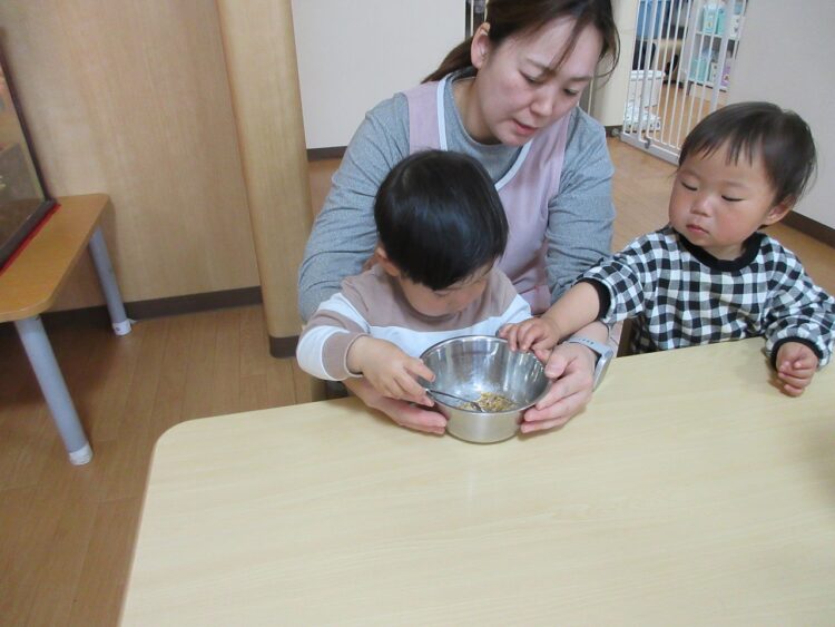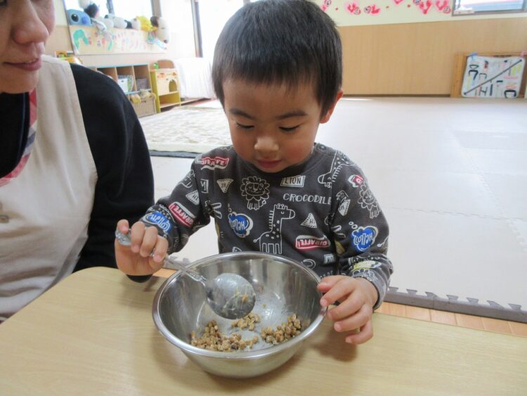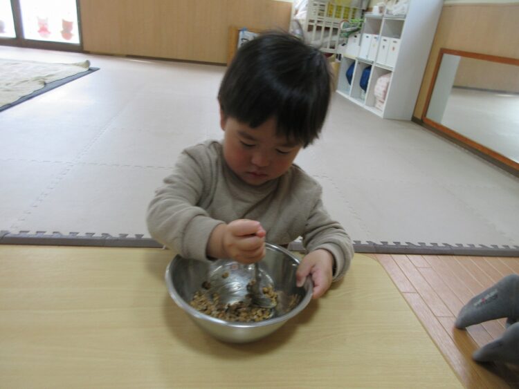 納豆は、混ぜれば混ぜるほど美味しくなるんだよ。と教えてくれたので、さくらんぼさんも混ぜるお手伝いです。