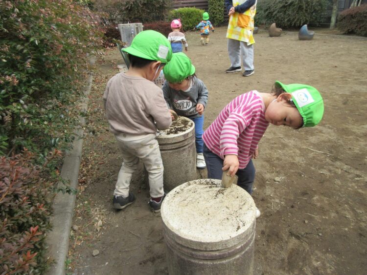 穴の中に石をいれたり、落ち葉や土を入れて作っていきます。