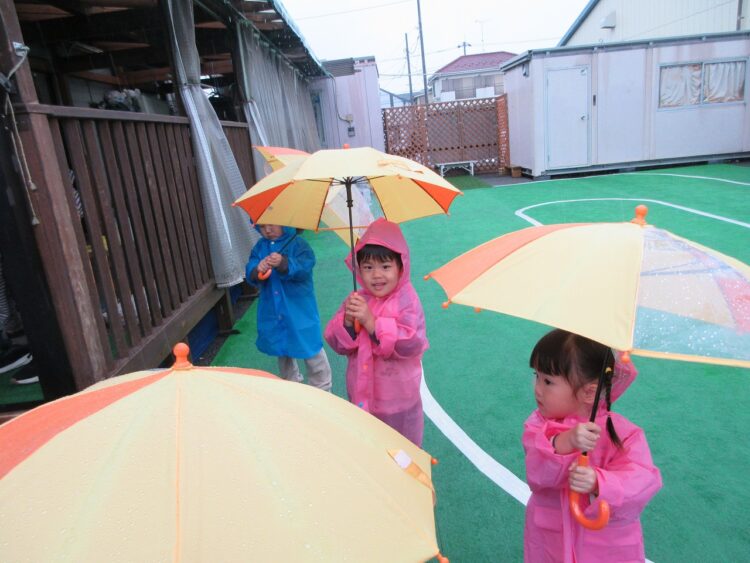 雨の音を聞いたり、水たまりを歩いてみたり…(笑)