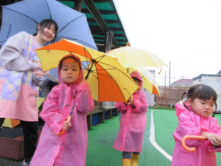 大きい子たちが傘をさしてお散歩に行く様子を見ていたさくらんぼさん。