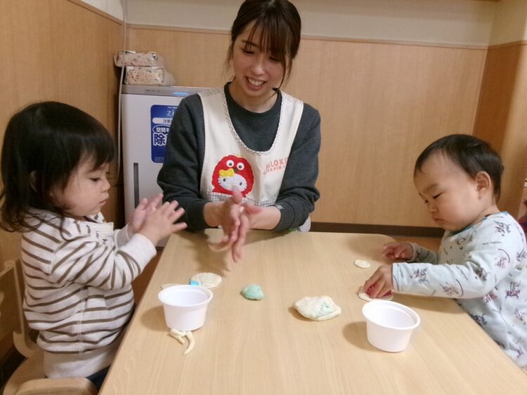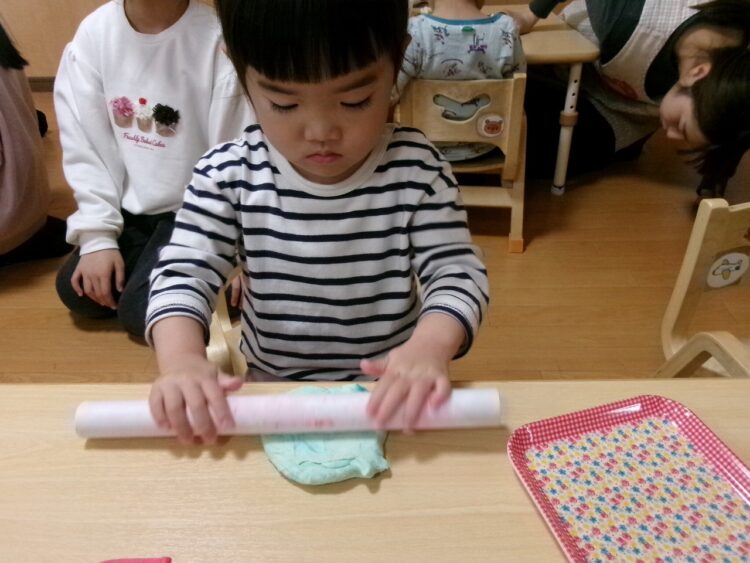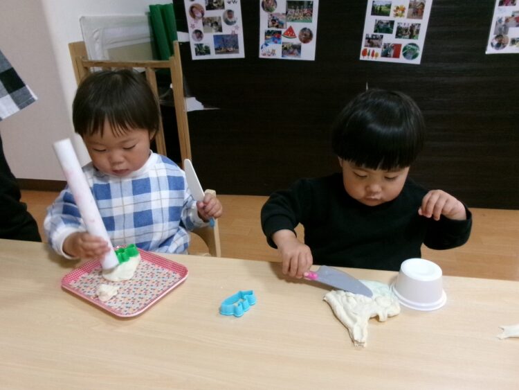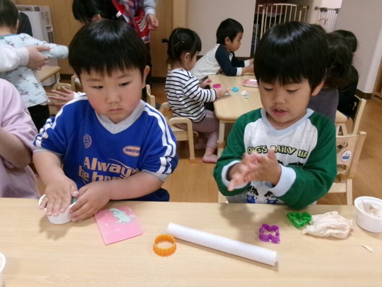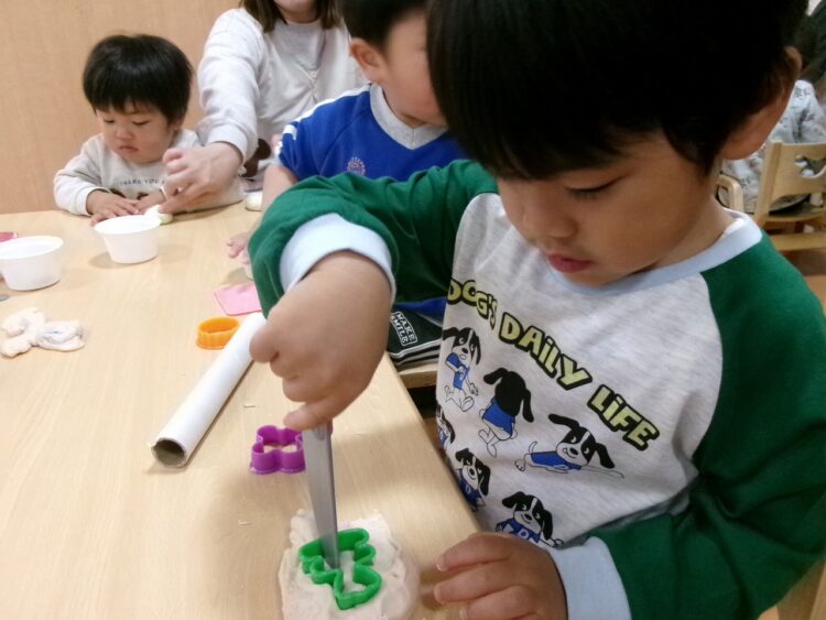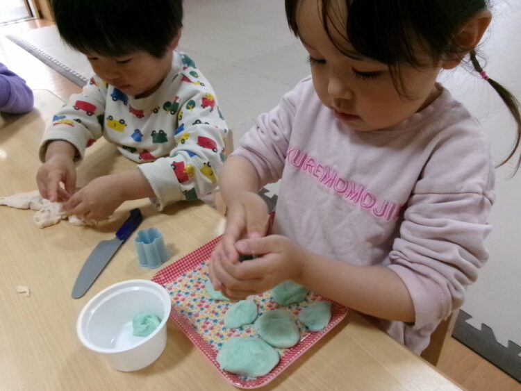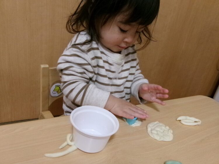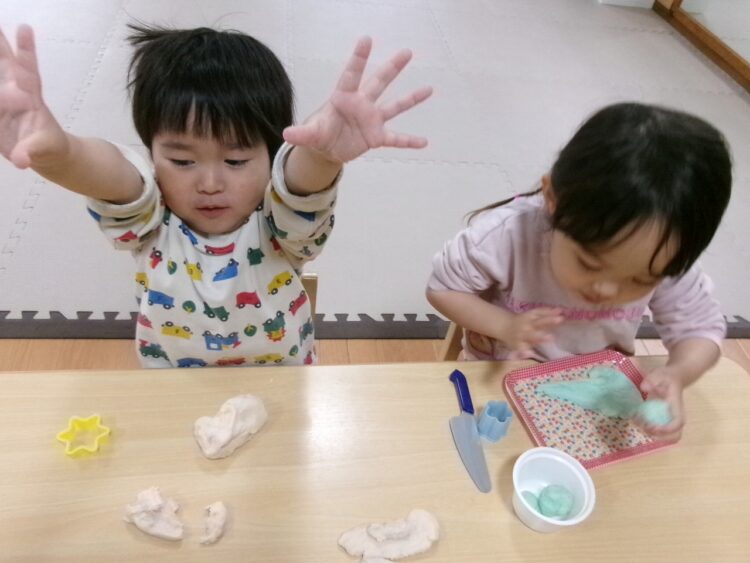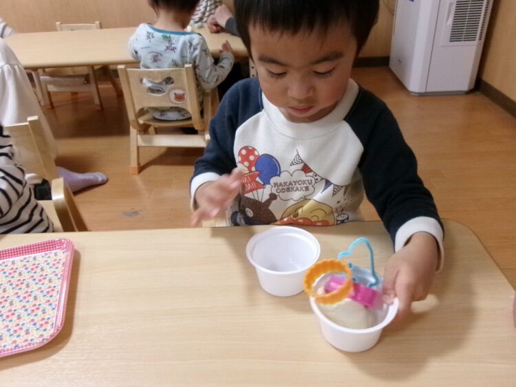しっかり体を動かした後は、「静の遊び」で小麦粉粘土をしました。
