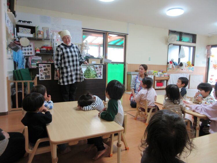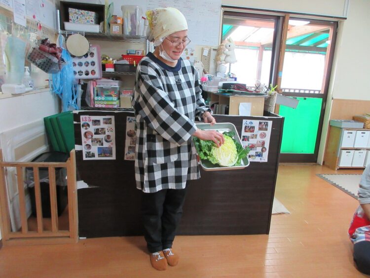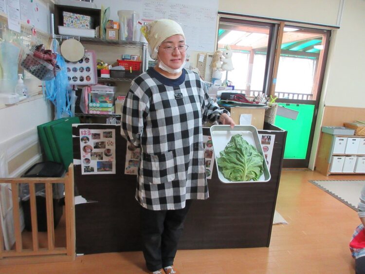 食育に登場したのは、大きなキャベツ…「春キャベツ」です。