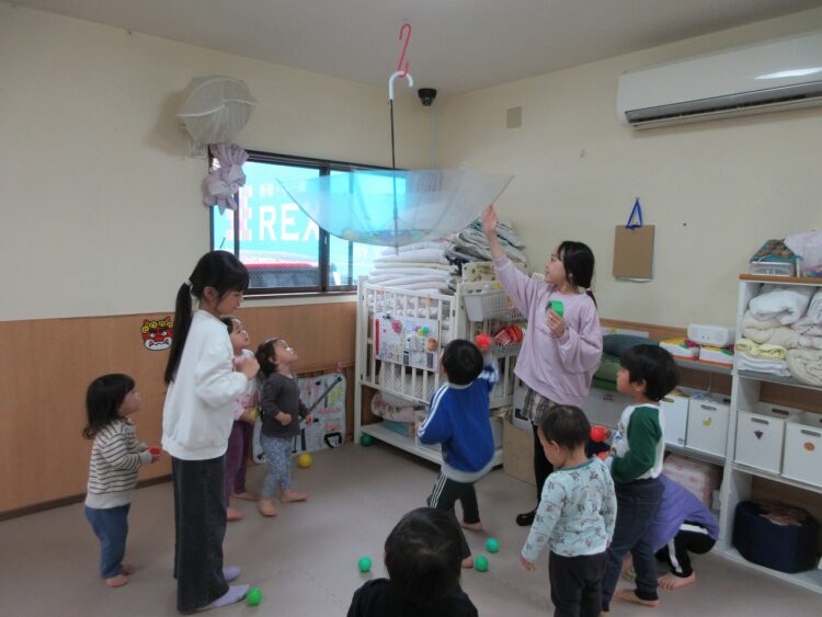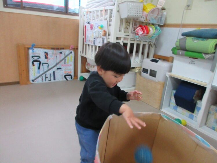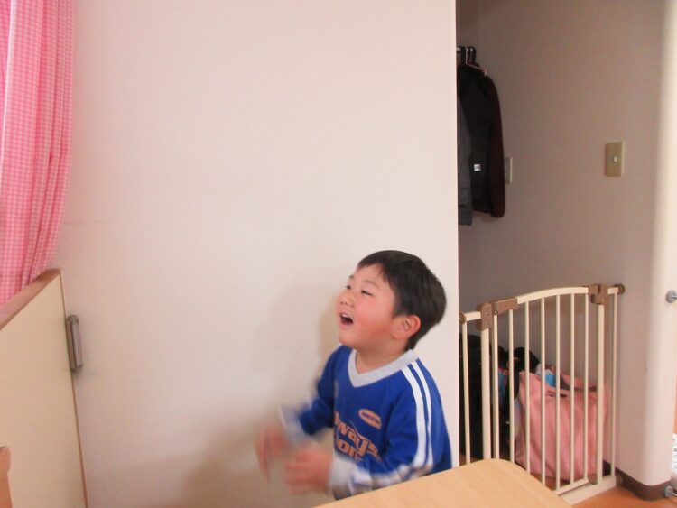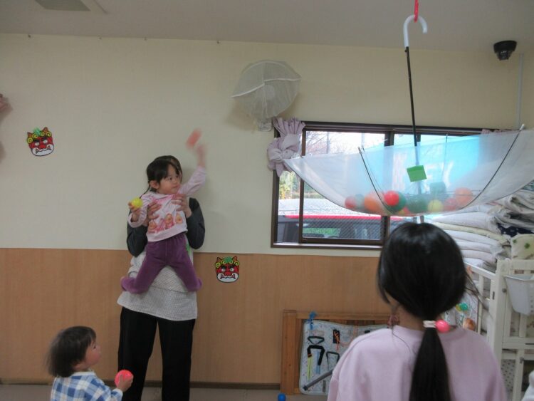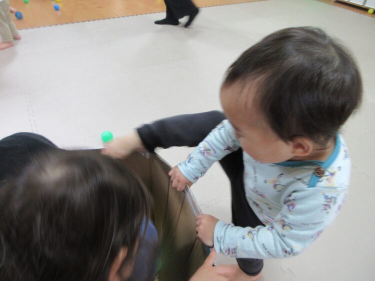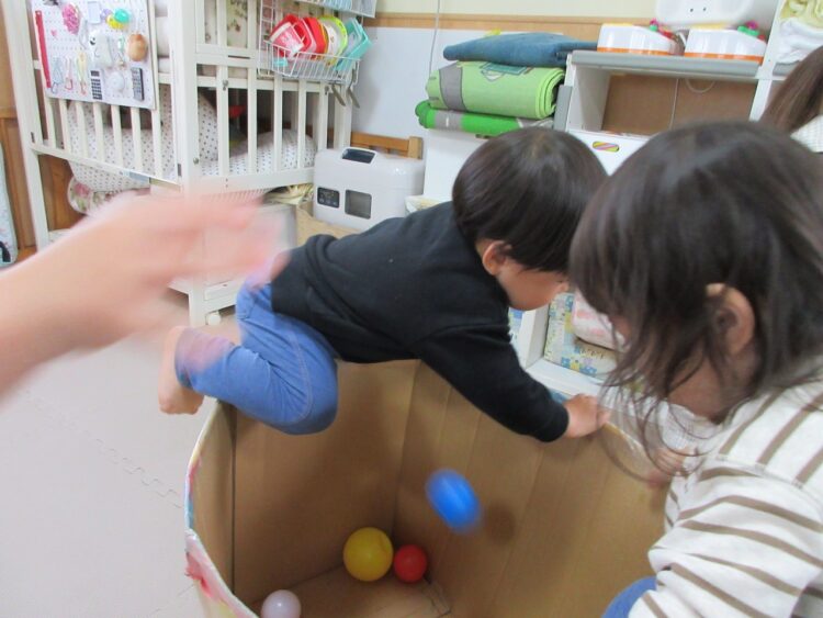 保育士さんにも手伝ってもらい…「えいっ!やったー!入ったね」