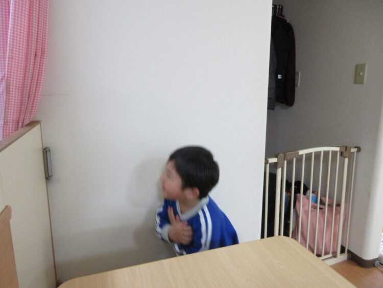 恥ずかしがり屋の〇〇君は、体操するのも端っこのほうで…。