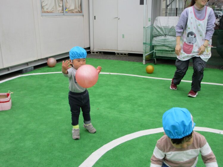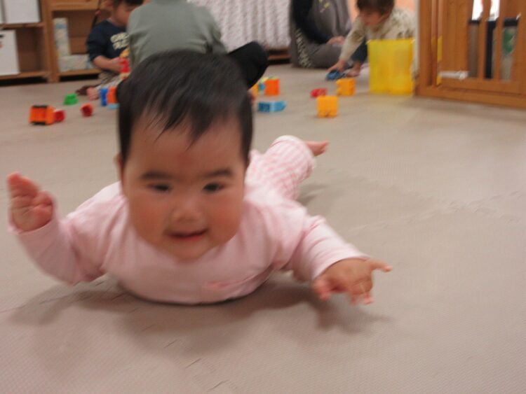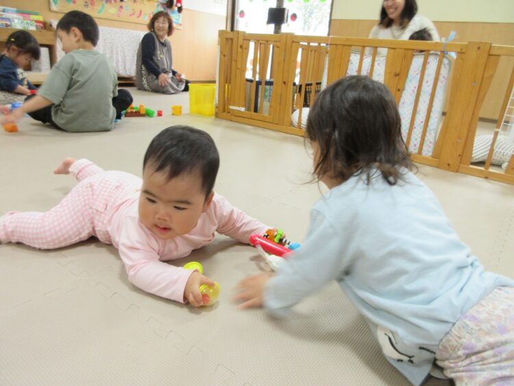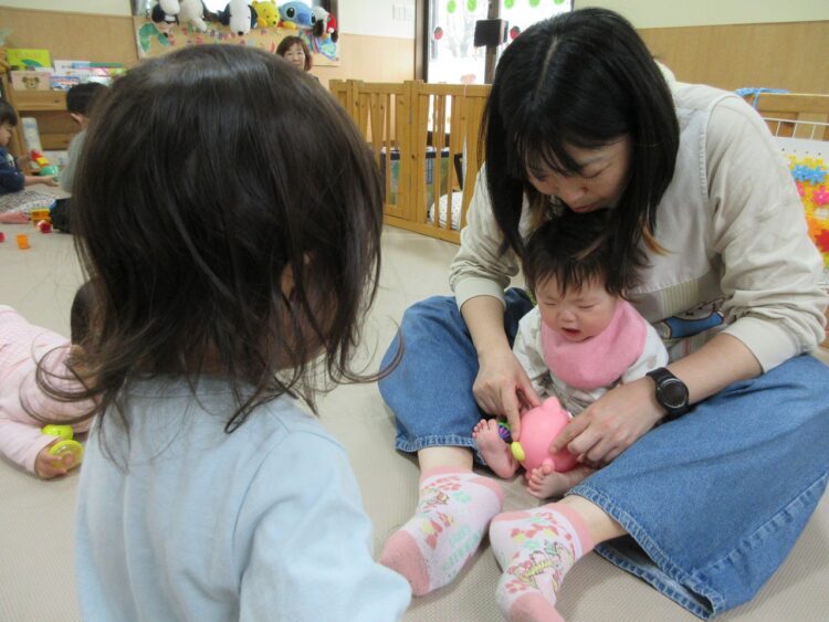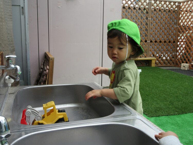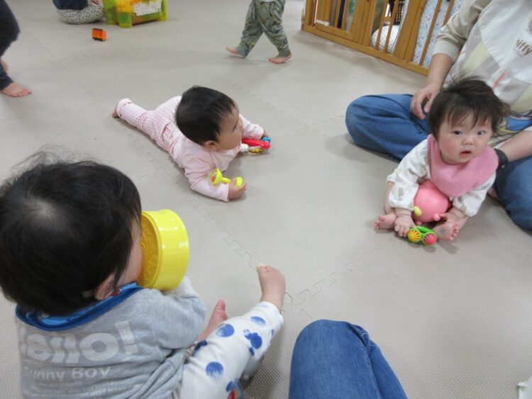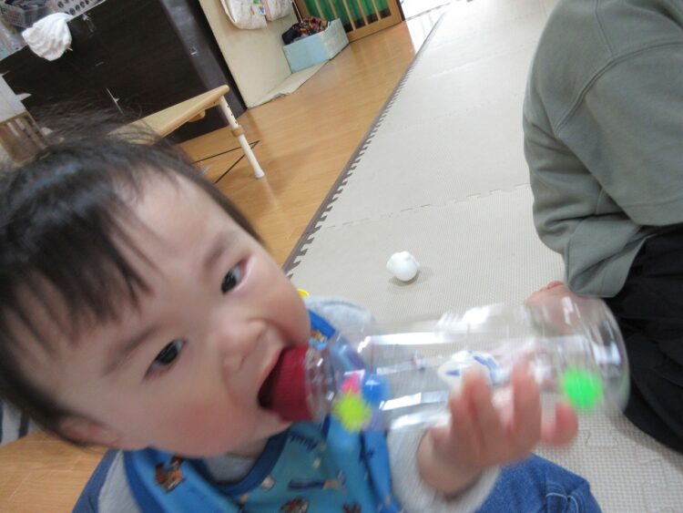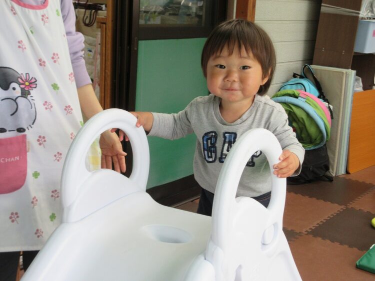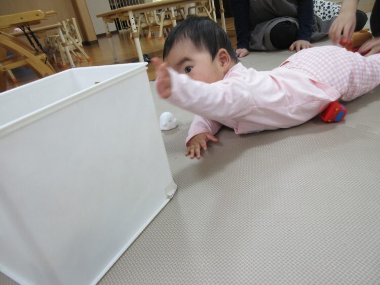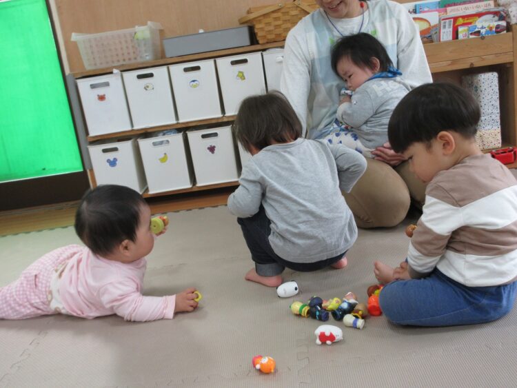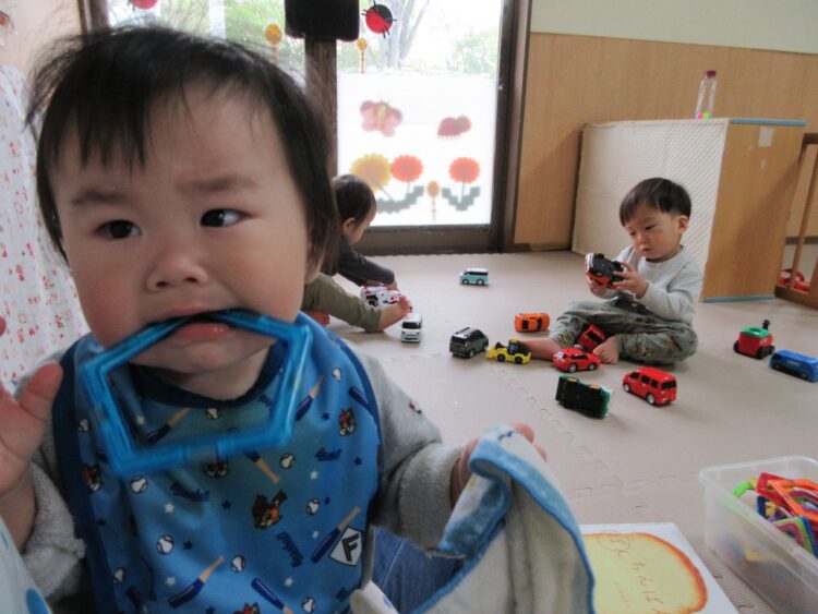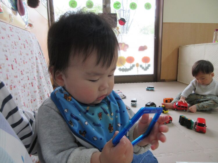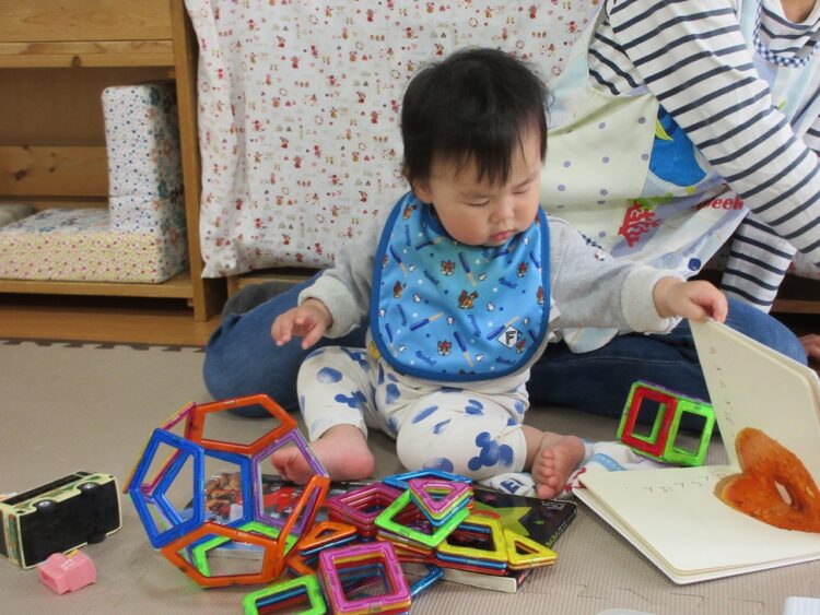 いつもは保育士にべったりくっついていますが、興味があるものを見つけると、自然と保育士から離れて遊び始めています。