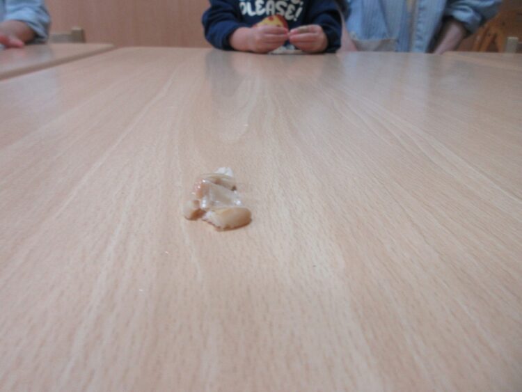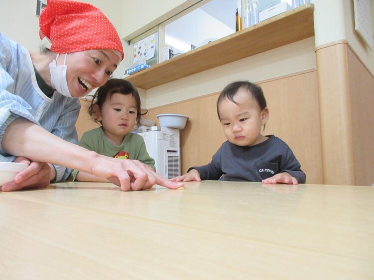 調理さんが、やわらかいお豆の感触を見せてくれました。