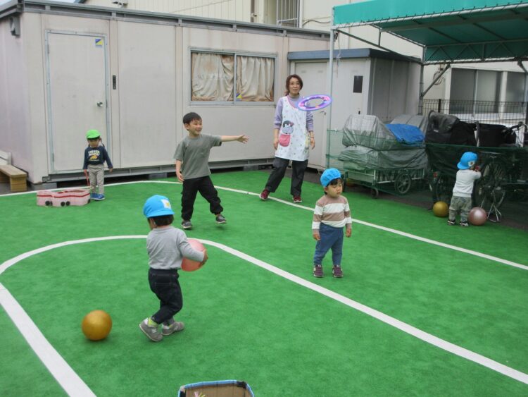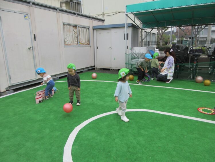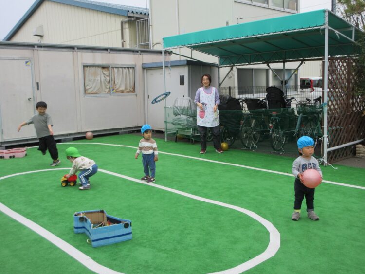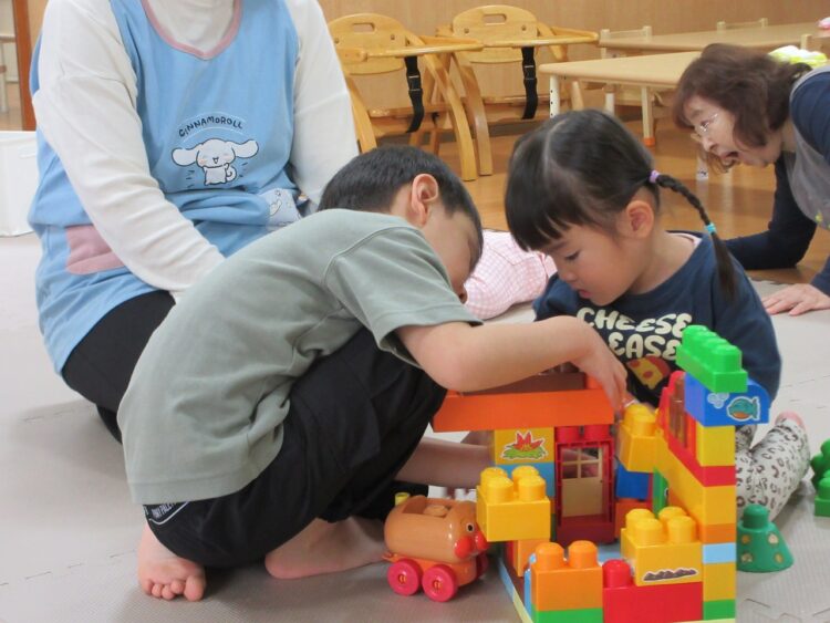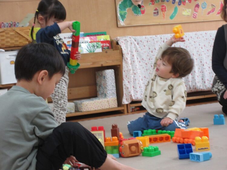 ゆっくりとブロックなどで遊ぶコーナーと、テラスには身体を動かして遊ぶコーナーを用意して、子どもたちが自由に好きなところへ行けるように工夫しています。