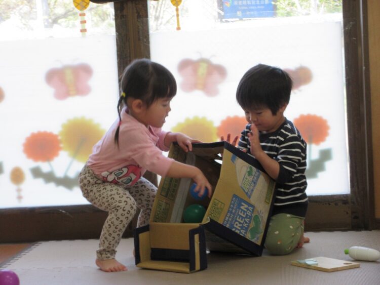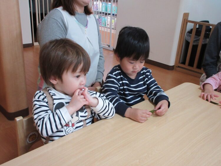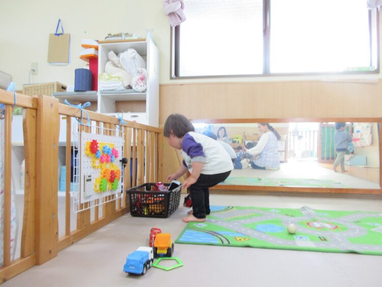 「オヤツだよー!」「朝の会するよー」の保育士さんの声掛けに、せっせとお片づけを率先して手伝ってくれる〇〇君。