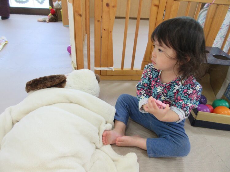 〇〇ちゃんは、仲良しのワンワン(ぬいぐるみ)のお世話に大忙し!(笑)