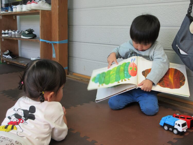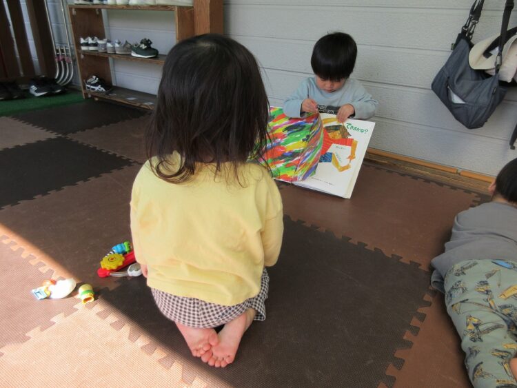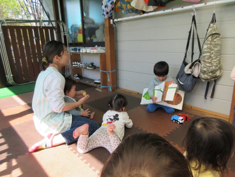 朝の自由時間、〇〇君先生が絵本の読み聞かせをしてくれました♡