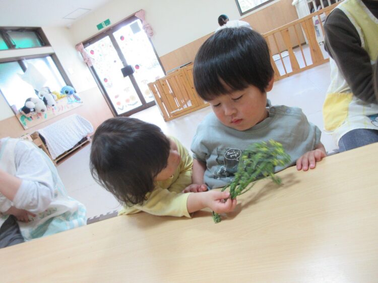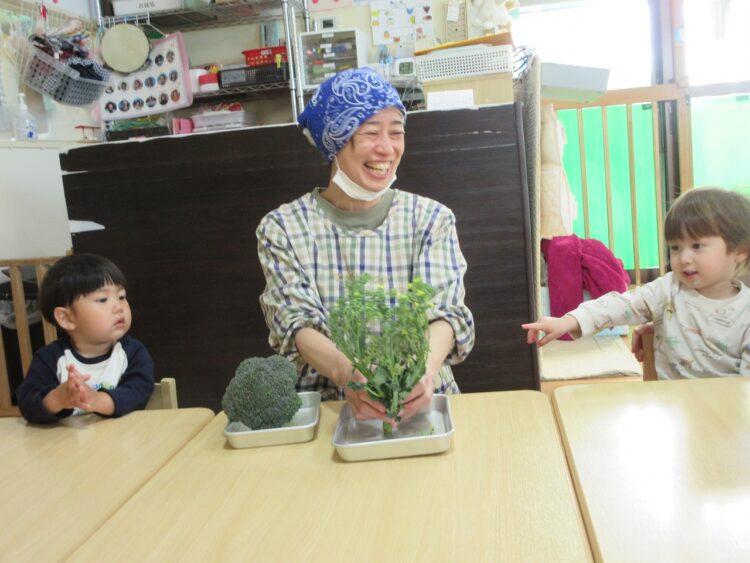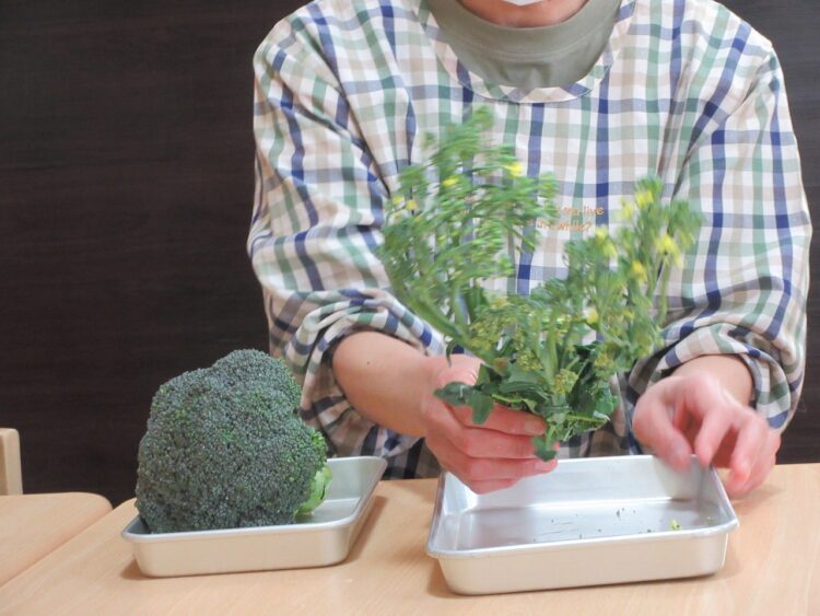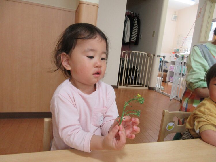 朝の食育に登場したのは「ブロッコリー🥦」ではなく、今日はそのブロッコリーのお花を観察です。