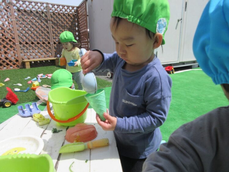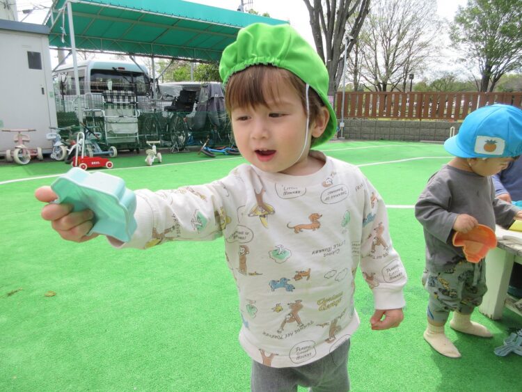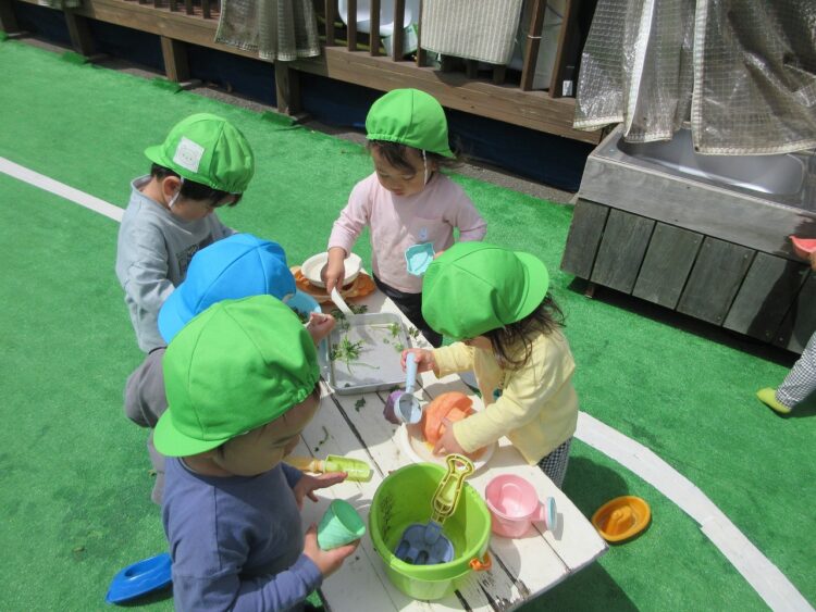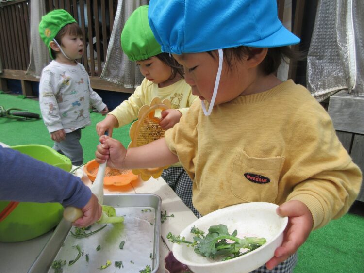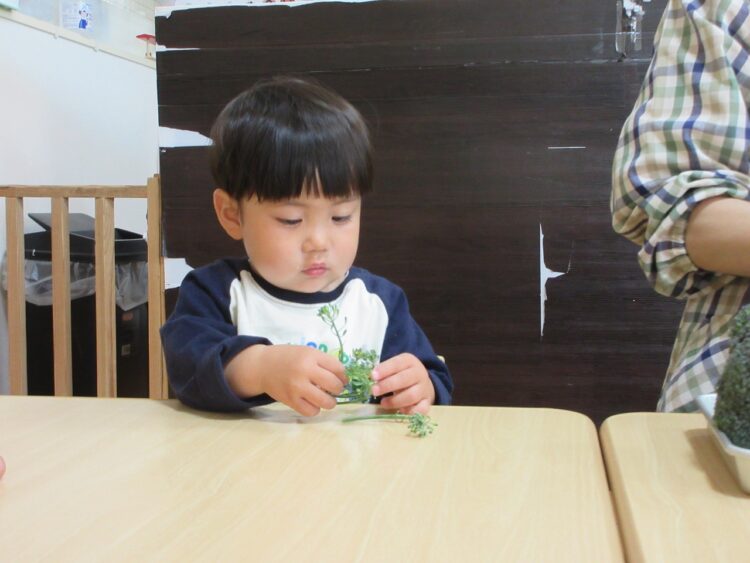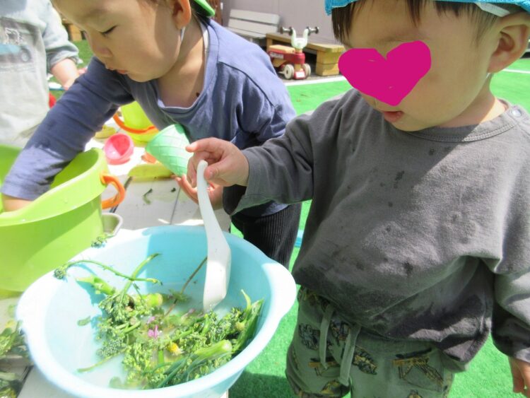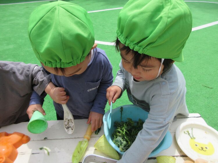 園庭に戻った後、朝の食育で見た「ブロッコリーのお花」を使って、おままごと遊びをしました。