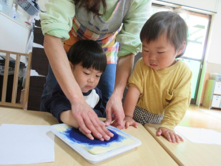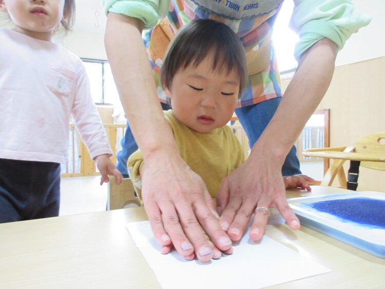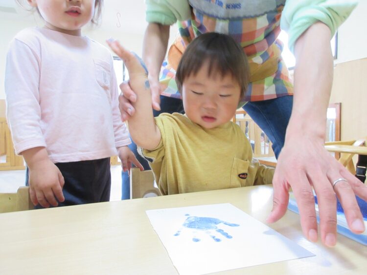 お散歩へ行く前に、製作用の手形を取りました!!