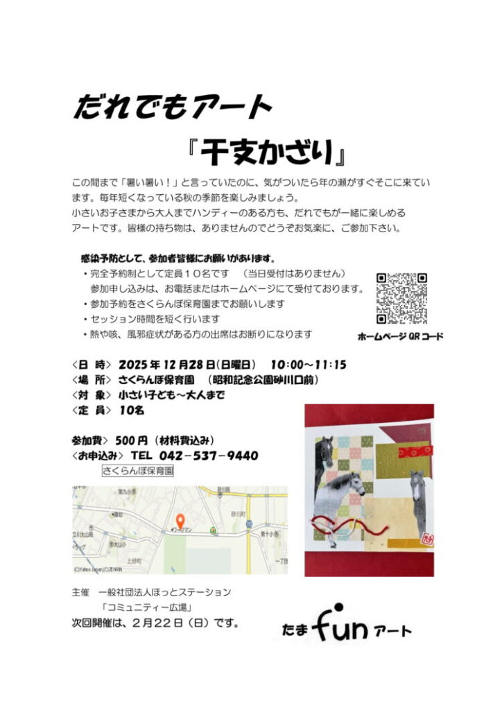 来る12月28日(日)に、今年最後のだれでもアートを開催します!! 今回のテーマは、「干支かざり」 来年の干支である「馬」をモチーフにしたアート作品を作ります♬ 自由な発想で、自由な表現、自由なアートを楽しんでみませんか? ご予約が埋まってきていて、残りの枠が2名となっております。 参加ご希望の方は、こちらからお申し込みください。