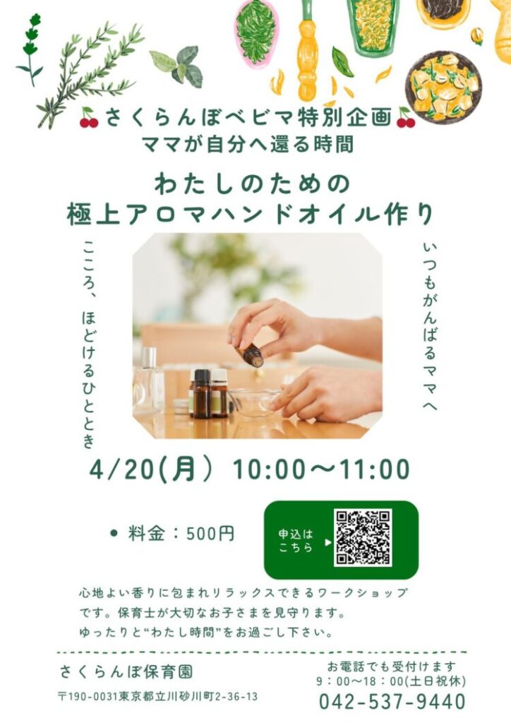 ベビマ特別企画として、今年度最初のイベントは「アロマハンドオイル作り」を開催します!!